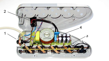 Многие путают обычный удлинитель с СФ, так как внешне они очень похожи. Поэтому остановимся на выборе СФ. СФ должен  включать в себя предохранитель (1), кнопку включения (2), набор розеток с заземлением (3), и внутри должна находиться микросхема (фильтр помех- 4).