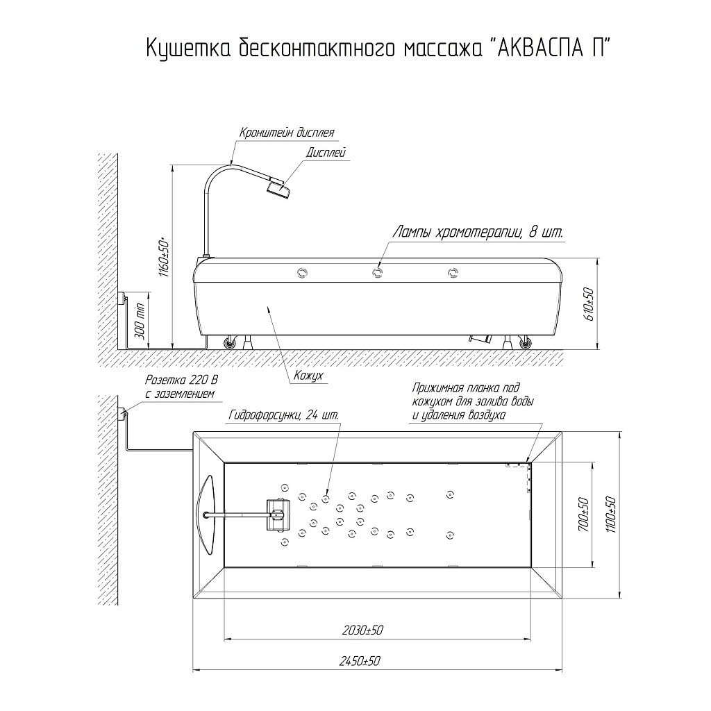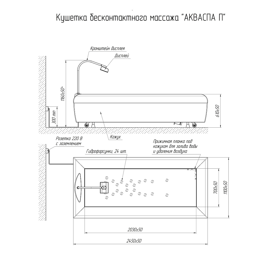 Бесконтактная гидромассажная ванна AQUASPA - это сочетание классического действия гидромассажа и новых технических возможностей. Прочная эластичная ткань покрывает специальное ложе, заполненное водой и снабженное системой из 24 гидрофорсунок, создающих комбинации потоков воды разной интенсивности и площади.